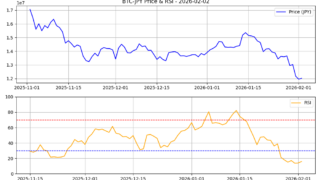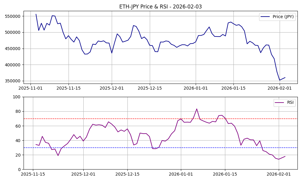 2026年2月3日、ビットコインに続きイーサリアム(ETH)も非常に興味深い、そして投資家にとっては緊張感のあるデータを示しています。現在のイーサリアム市場は、テクニカル的に見ても**「極限の売られすぎ状態」**に突入したと言えるでしょう。